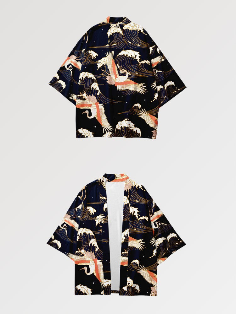 Cárdigan de estilo haori moderno que representa grullas volando sobre el mar